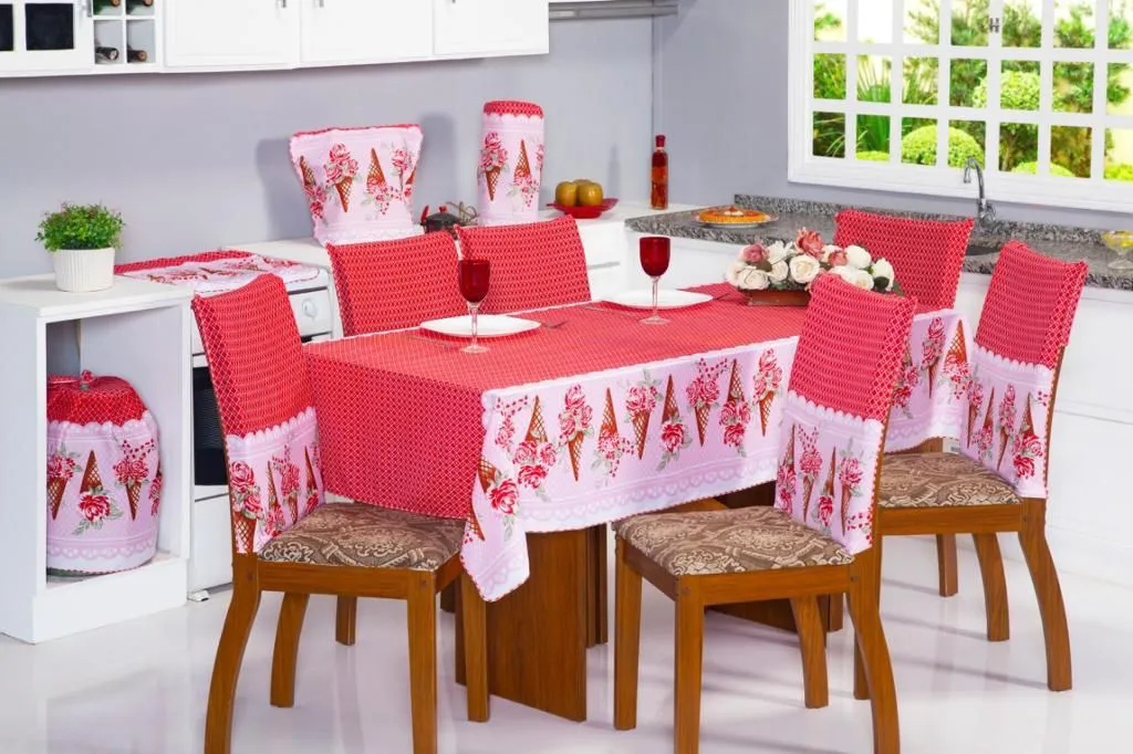 JOGO COZINHA OXF C/ TOALHA DE MESA 4 LUGARES + 4 CAPAS P/ CADEIRAS ESTAMPADA NOBRE
